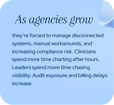 Homecare Homebase is a purpose-built EHR for home health and hospice agencies. It connects clinical care, compliance, and operations in one system.